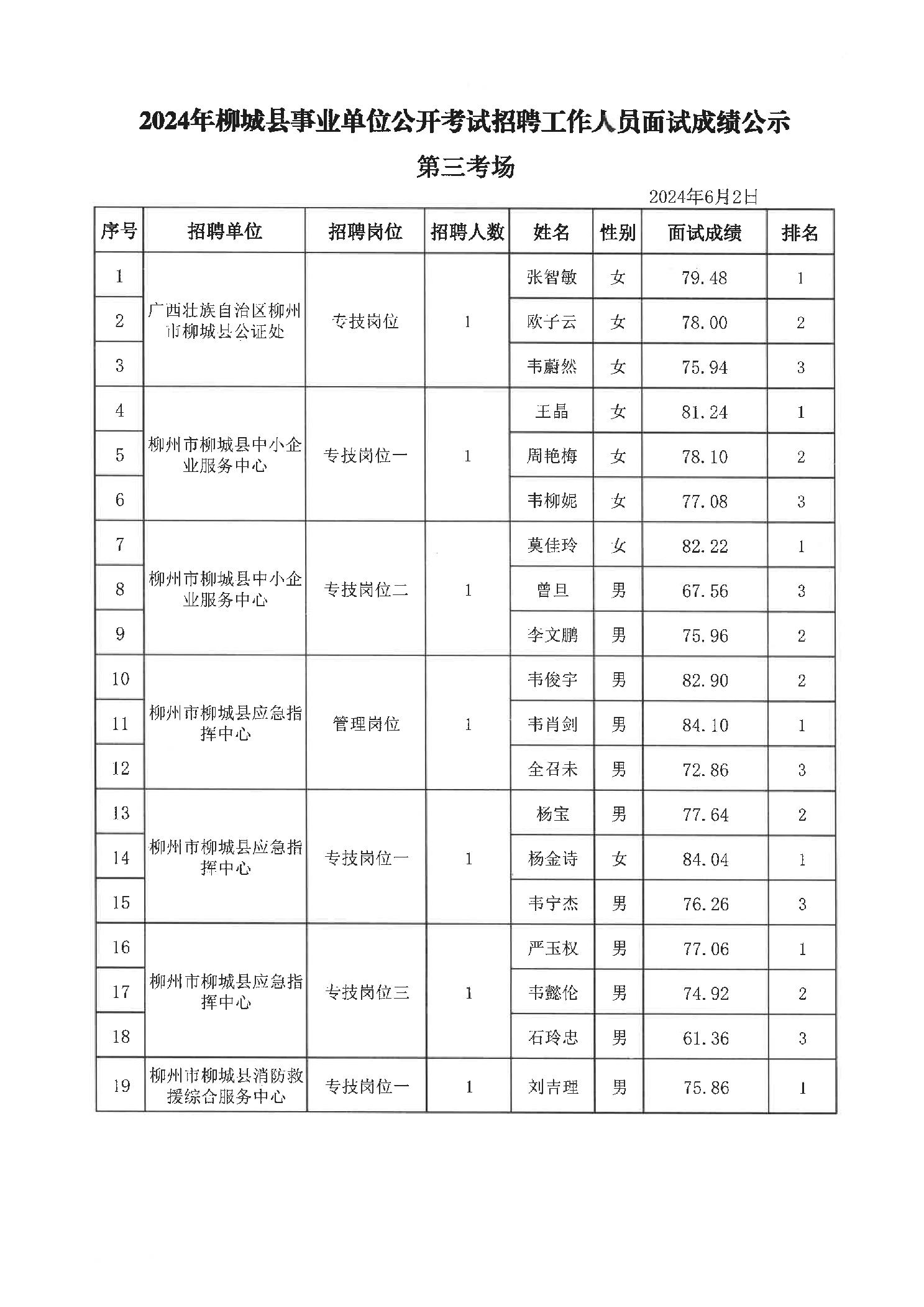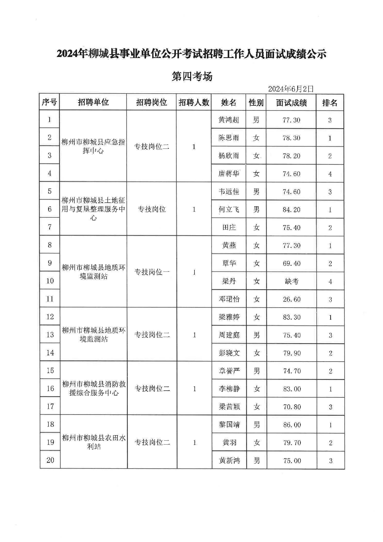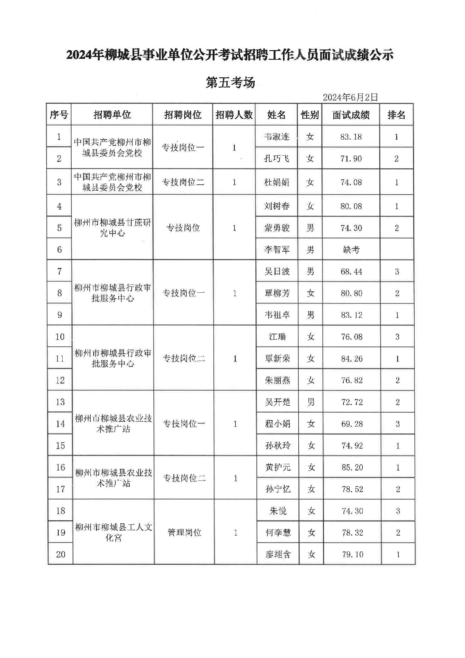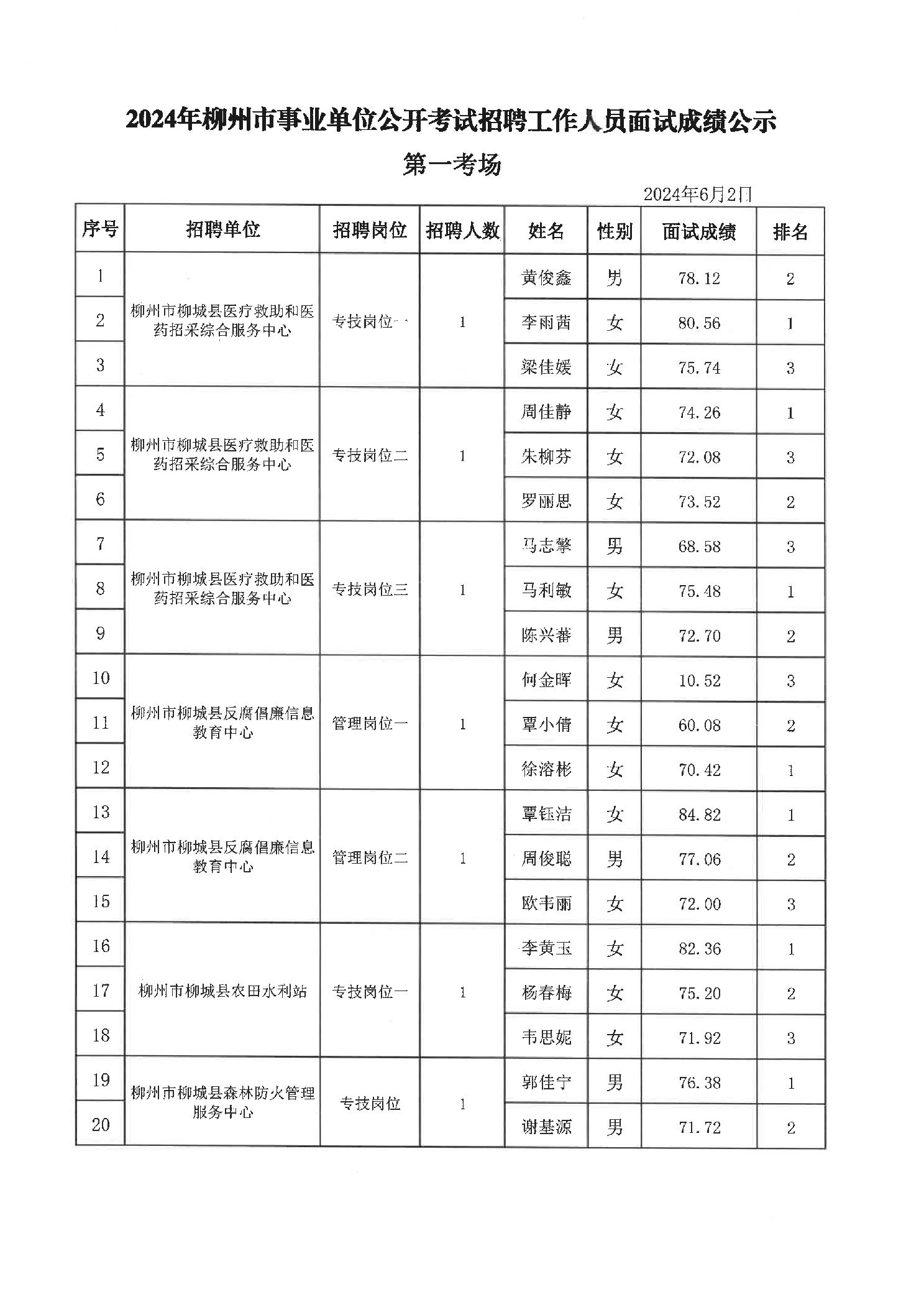 2024年柳城縣事業(yè)單位公開考試招聘工作人員面試成績(jī)公示