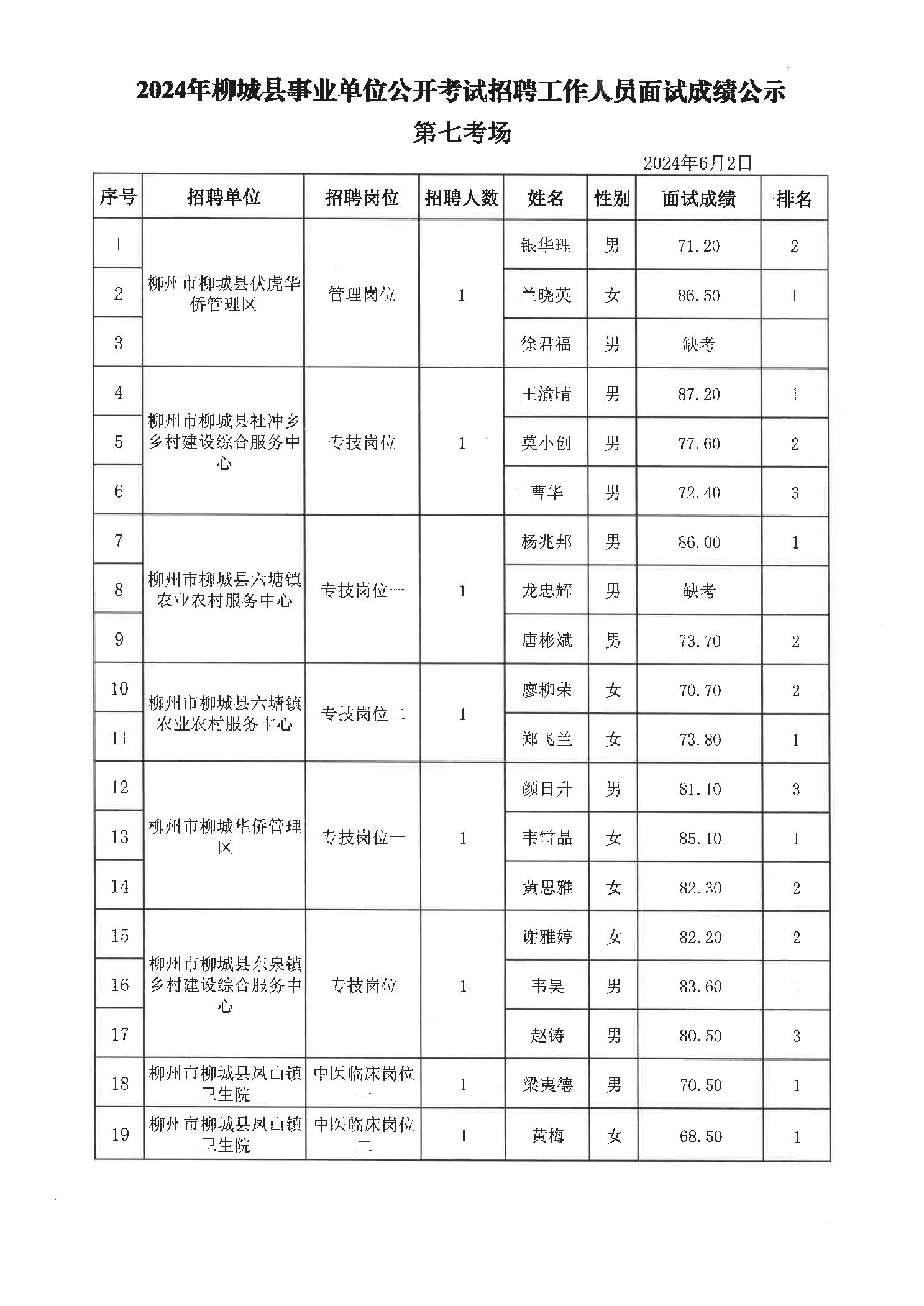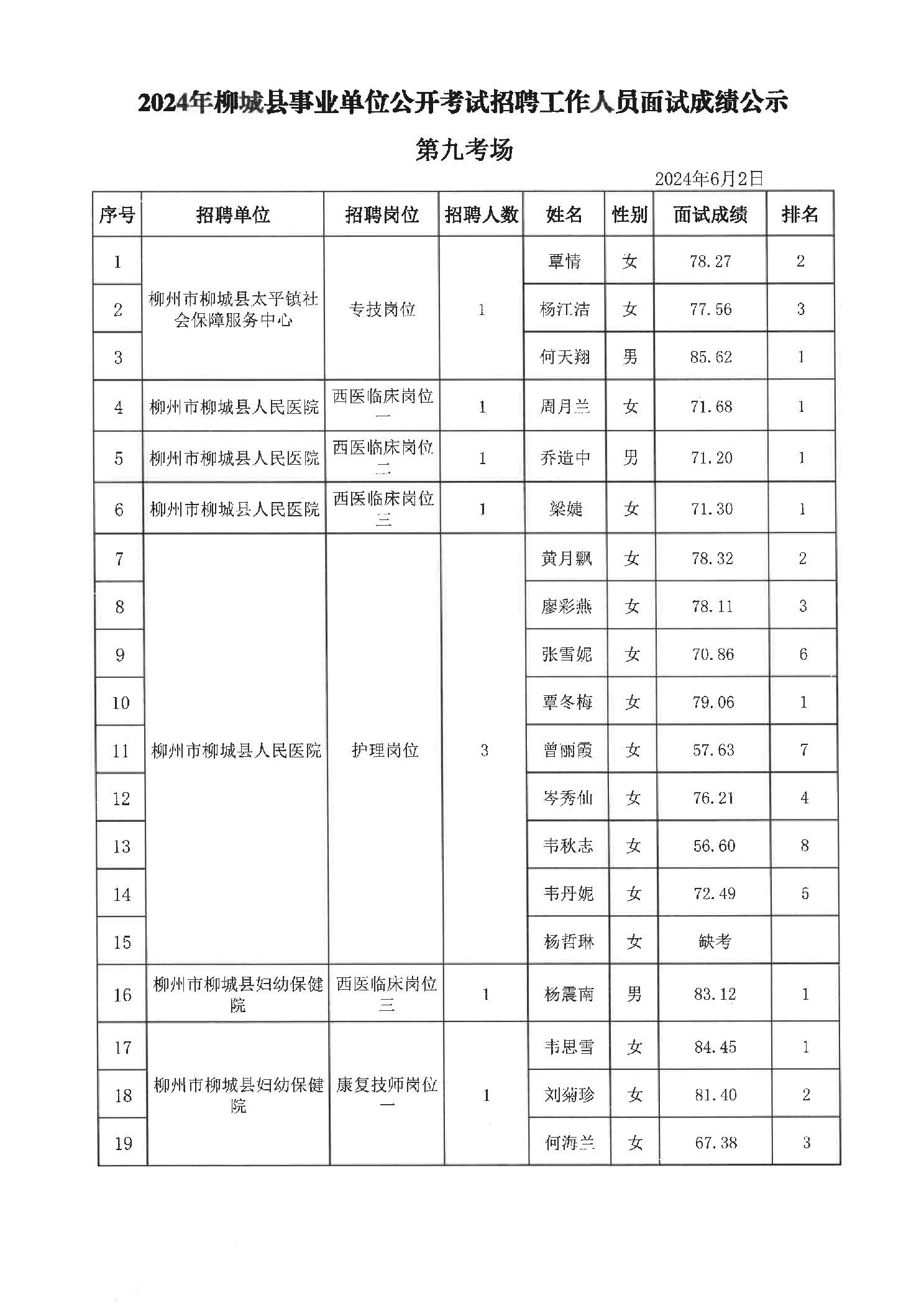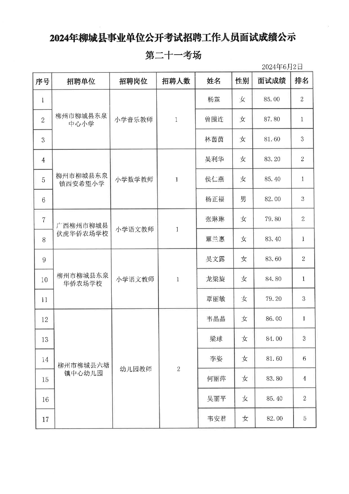 2024年柳城縣事業(yè)單位公開考試招聘工作人員面試成績(jī)公示
