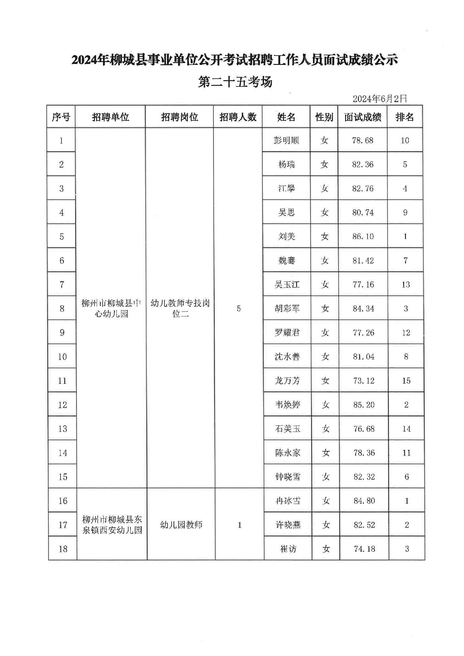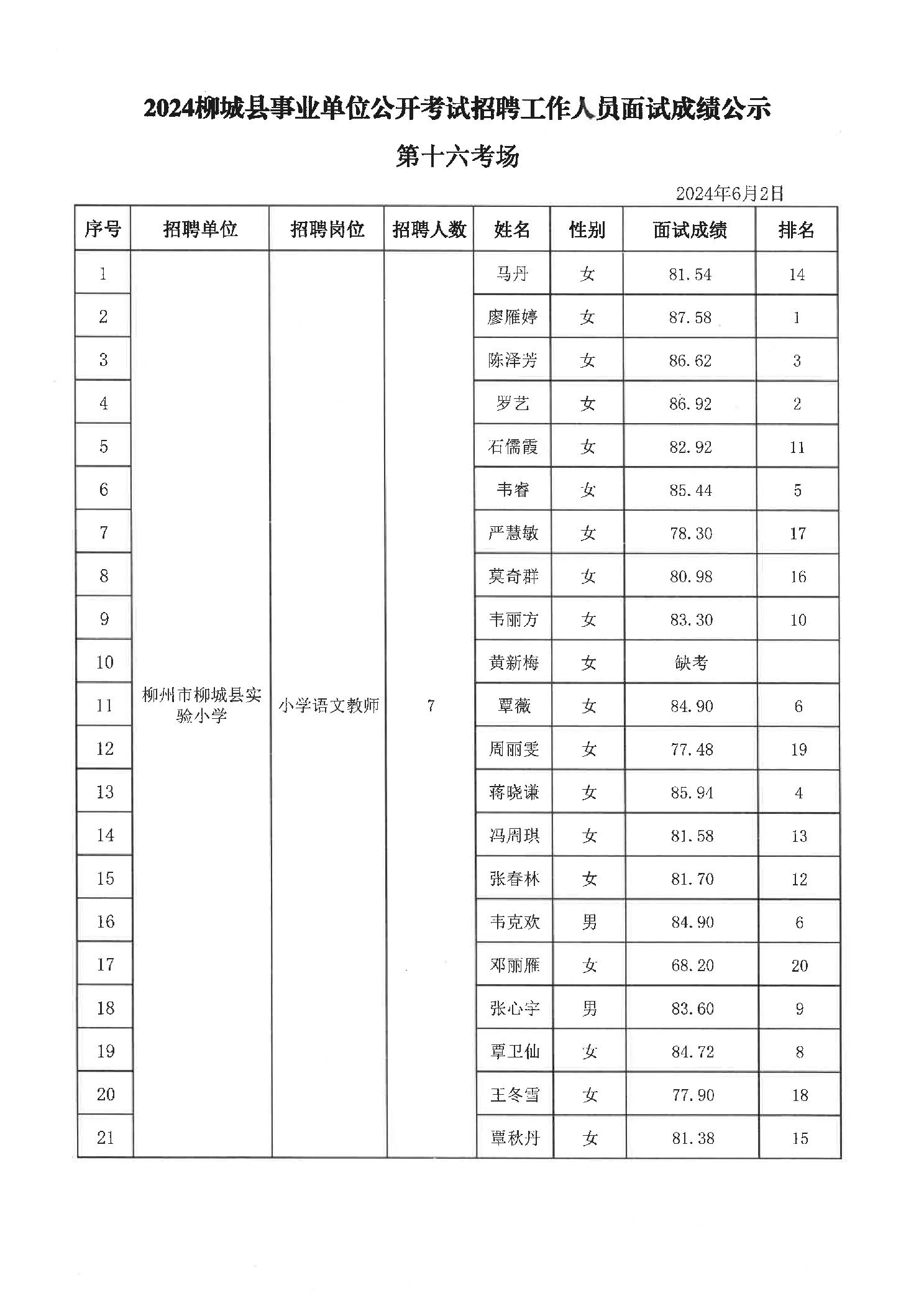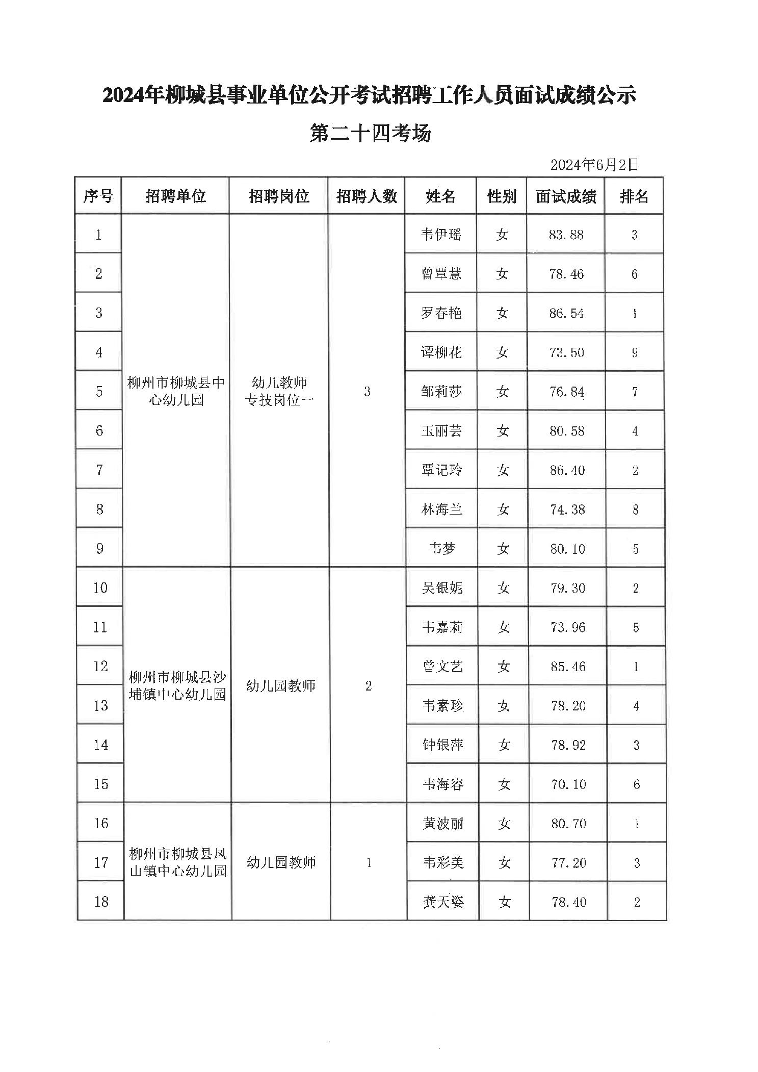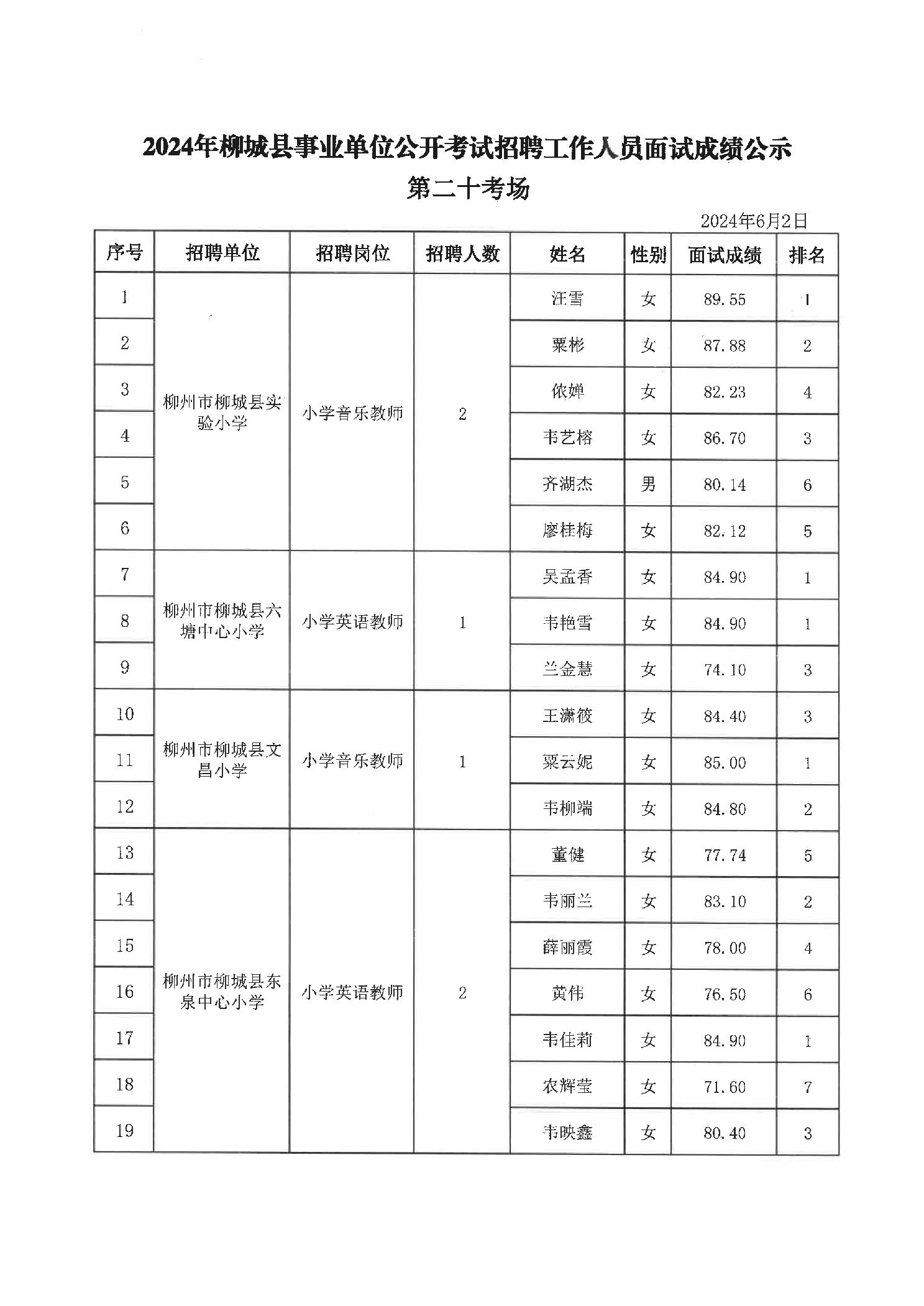 2024年柳城縣事業(yè)單位公開考試招聘工作人員面試成績(jī)公示