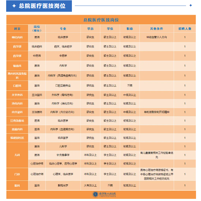 以上崗位均享受醫(yī)院科研獎勵、培訓(xùn)進修、晉升職務(wù)職稱等權(quán)利,以及五險一金、用餐補助、帶薪年休假、工會福利等待遇。