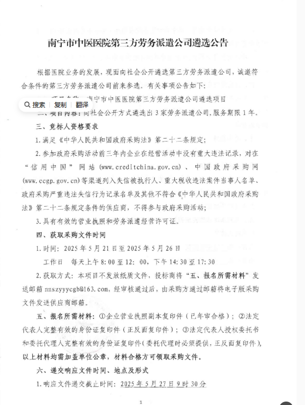 2025年廣西南寧市中醫(yī)醫(yī)院第三方勞務派遣公司遴選公告