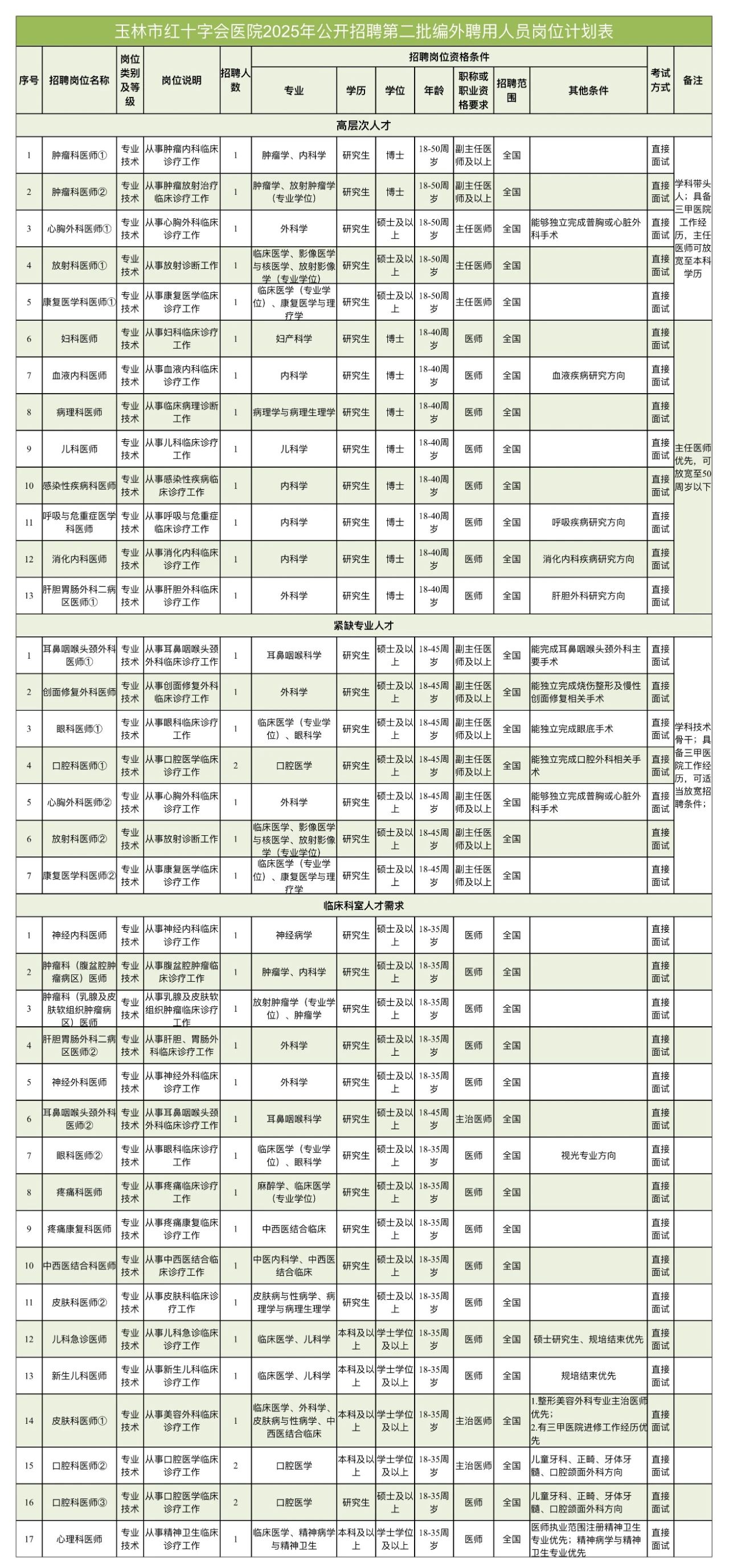 4.醫(yī)師人員:采取直接面試進(jìn)行考核,醫(yī)院統(tǒng)一安排集體面試;面試考核內(nèi)容包括專業(yè)知識、學(xué)術(shù)水平、學(xué)習(xí)和業(yè)務(wù)能力、組織協(xié)調(diào)能力、職業(yè)性格傾向、語言表達(dá)能力、興趣愛好和特長等。