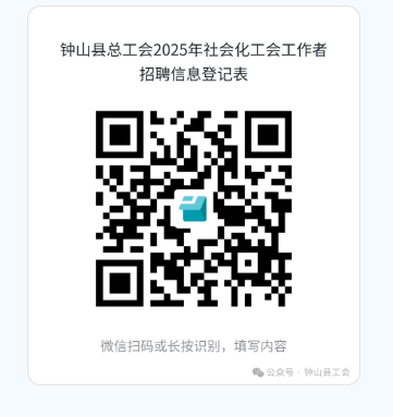 2.報名方式:采取網(wǎng)上報名方式報名。報名時間截止前,有意者請根據(jù)附件1填寫個人簡歷,并用微信掃描下方二維碼打開小程序填寫《鐘山縣總工會2025年社會化工會工作者招聘信息登記表》,上傳個人簡歷、身份證掃描件、學(xué)歷證書掃描件、學(xué)信網(wǎng)教育部學(xué)歷證書電子注冊備案表、榮譽(yù)證書掃描件、發(fā)表文章等佐證材料,逾期不再接收任何報送材料。