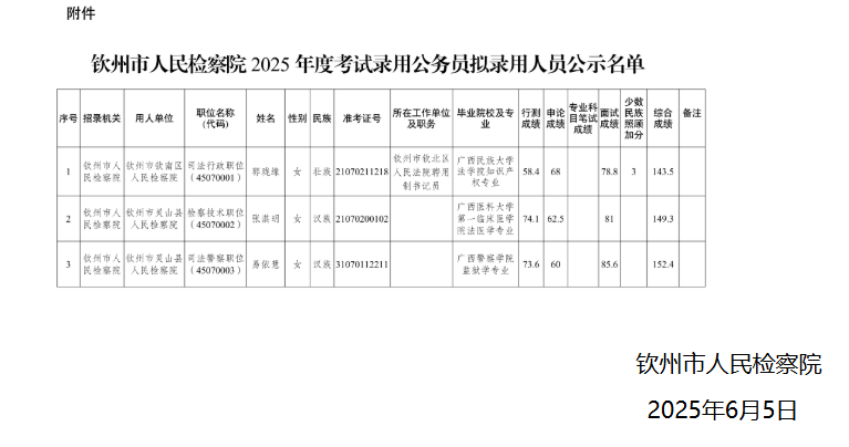 根據(jù)《廣西壯族自治區(qū)2025年度考試錄用公務員公告》等有關(guān)規(guī)定,我單位2025年計劃招錄3名公務員,經(jīng)過公開報名、資格審查、筆試、面試、體檢、考察等程序,擬錄用郭瓏緣等3名同志(附件)為公務員,現(xiàn)予以公示。公示期5個工作日,如對擬錄用人員的錄用資格有異議,請在公示期內(nèi)向欽州市人民檢察院政治部實名反映。
