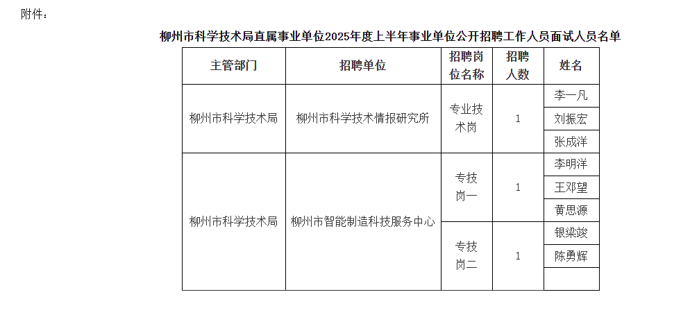 附件:柳州市科學(xué)技術(shù)局直屬事業(yè)單位2025年度上半年事業(yè)單位公開招聘工作人員面試人員名單