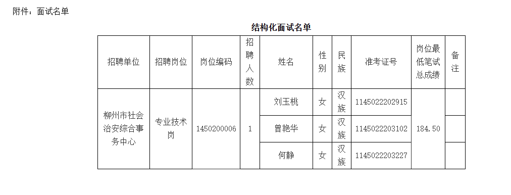 根據《2025年度柳州市事業(yè)單位公開考試招聘工作人員公告》、《關于印發(fā)〈廣西壯族自治區(qū)事業(yè)單位公開招聘工作人員面試工作規(guī)則(試行)〉的通知》(桂人社發(fā)〔2012〕79號)的規(guī)定,中共柳州市委政法委員會擬組織所屬年事業(yè)單位公招面試,現將相關事宜公告如下: