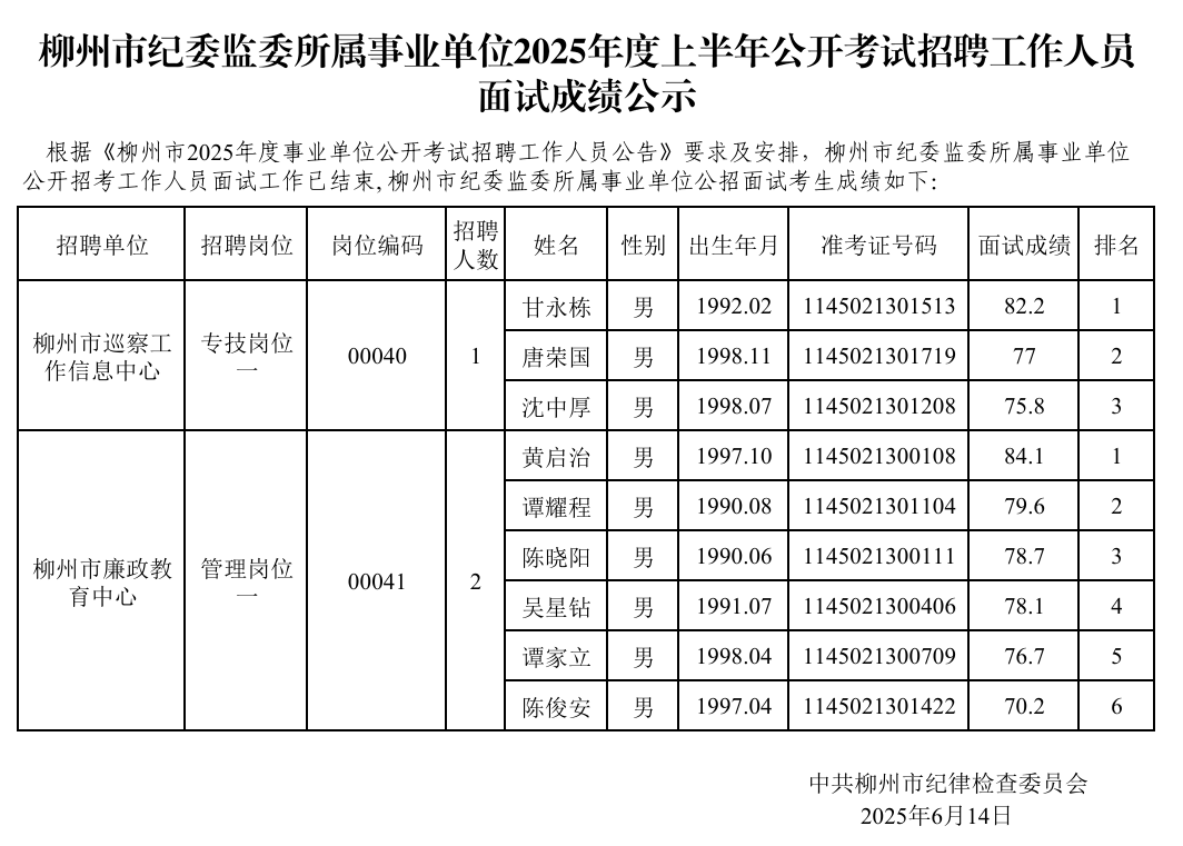 原文標(biāo)題:柳州市紀(jì)委監(jiān)委所屬事業(yè)單位2025年度上半年公開考試招聘工作人員面試成績公示