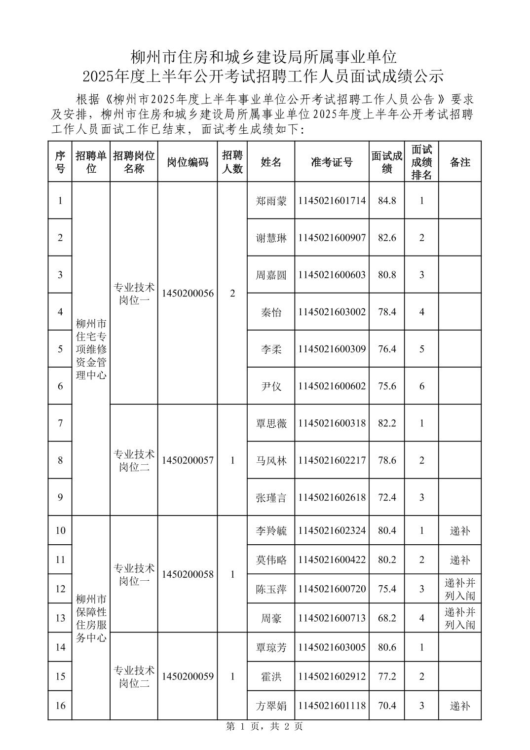 柳州市住房和城鄉(xiāng)建設(shè)局所屬事業(yè)單位2025年度上半年公開考試招聘工作人員面試成績公示