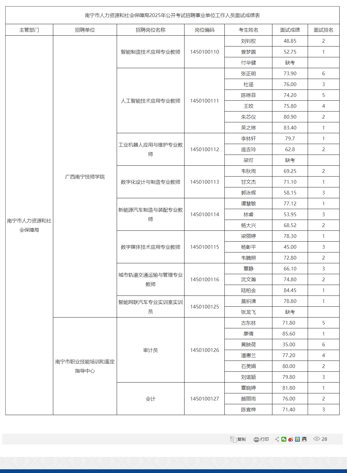原文標(biāo)題:南寧市人力資源和社會(huì)保障局2025年公開考試招聘事業(yè)單位工作人員面試成績(jī)表