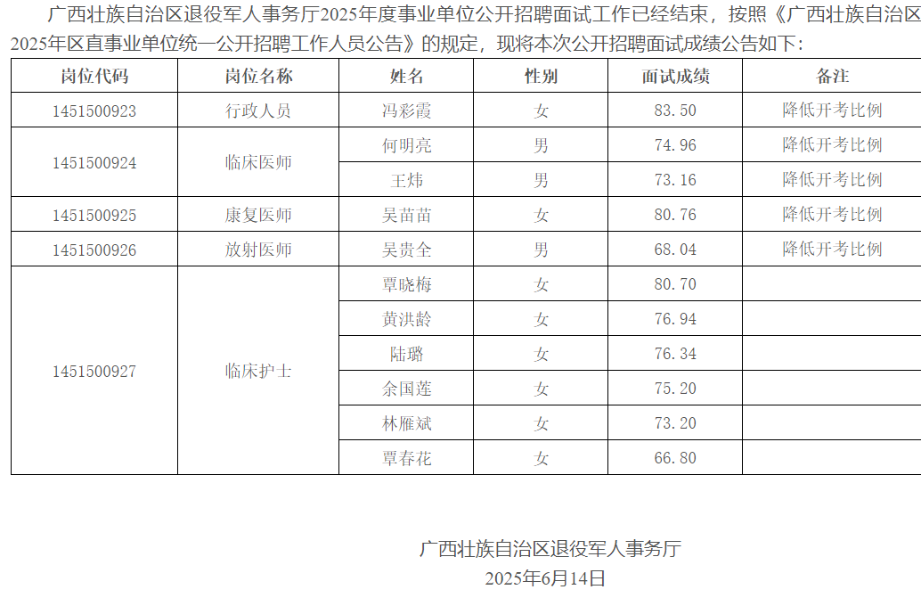 廣西壯族自治區(qū)退役軍人事務(wù)廳關(guān)于發(fā)布2025年度事業(yè)單位公開(kāi)招聘面試成績(jī)的公告