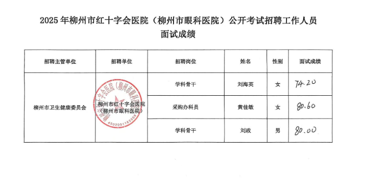 2025年度柳州市紅十字會(huì)醫(yī)院(柳州市眼科醫(yī)院)公開(kāi)招聘中高級(jí)(急需緊缺)人才(第二批)面試成績(jī)公示