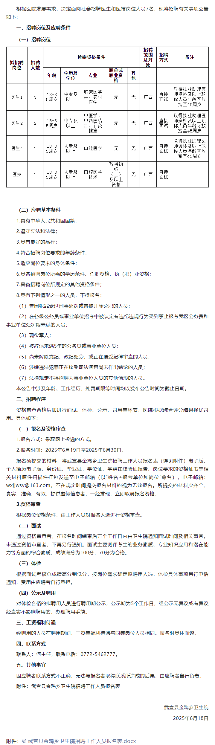 原文標(biāo)題:武宣縣金雞鄉(xiāng)衛(wèi)生院2025年公開(kāi)招聘編外聘用人員公告(第二期)
