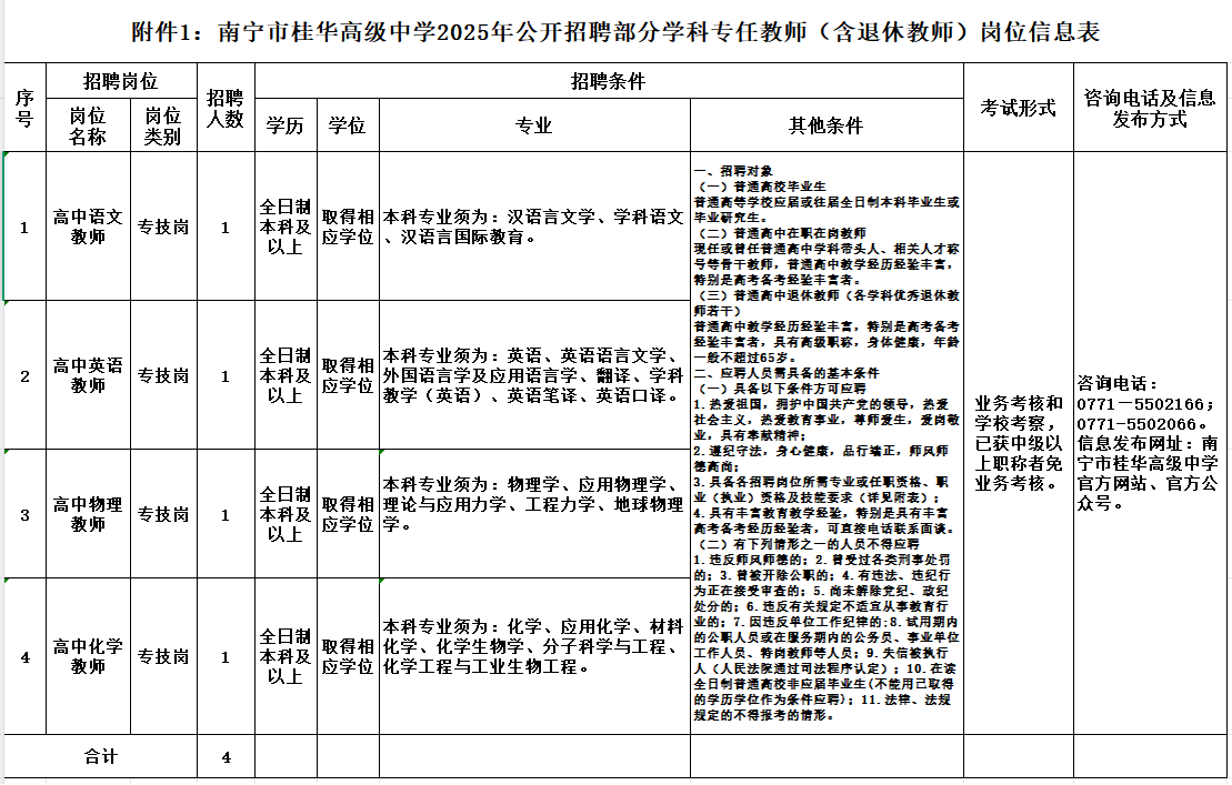 附件1:《南寧市桂華高級中學(xué)公開招聘專任教師(含退休教師)崗位信息表》