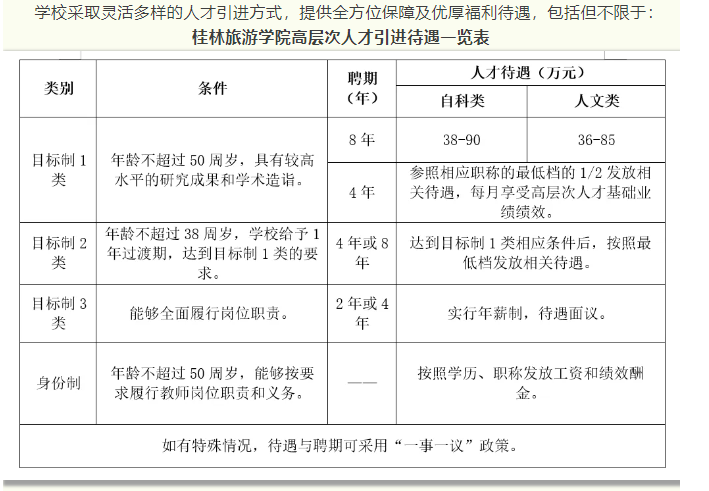 4.根據(jù)自治區(qū)政府文件要求,符合相應(yīng)條件者,學(xué)校積極配合申請(qǐng)廣西壯族自治區(qū)高層次人才認(rèn)定和各類人才項(xiàng)目,若入選可享受各類優(yōu)厚的人才待遇,詳情請(qǐng)登錄廣西高層次人才“一站式”服務(wù)平臺(tái)(http://www.gxrc.org/)查閱。首次來(lái)桂工作的35歲以下、具有博士學(xué)位的青年人才,可按照政策申領(lǐng)自治區(qū)青苗人才普惠性支持。如入選桂林市高層次人才,還可以享受桂林市高層次人才有關(guān)津貼、購(gòu)房補(bǔ)貼和個(gè)稅獎(jiǎng)勵(lì)等人才補(bǔ)助。詳見桂林市高層次人才一站式服務(wù)平臺(tái)(https://gcc.glrcw.com/)。
