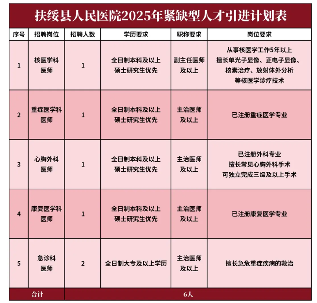 為進一步充實現有人才隊伍,促進醫(yī)院學科發(fā)展,提升醫(yī)院綜合實力,結合醫(yī)院實際工作需要,扶綏縣人民醫(yī)院決定面向社會進行公開招聘各類醫(yī)學人才,具體招聘事宜如下: