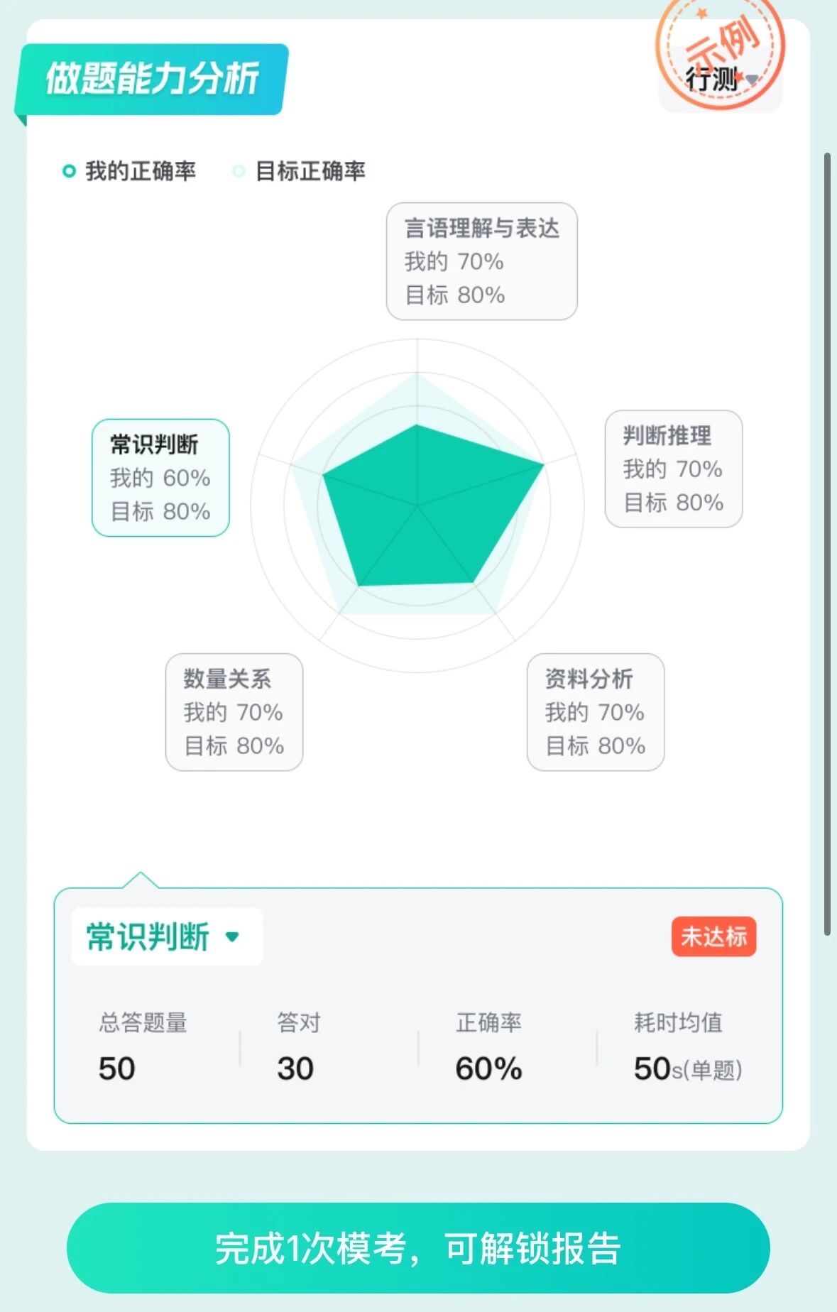 3??生成個人??紙蟾妫?/span>考完就能查看模考成績、排名及解析,生成的個人??紙蟾姘髂K正確率分布、做題能力分析、筆試分?jǐn)?shù)yu測等內(nèi)容。