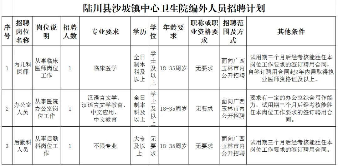 報名地點(diǎn):陸川縣沙坡鎮(zhèn)中心衛(wèi)生院公衛(wèi)樓五樓行政辦公室。(咨詢電話:7012189)。