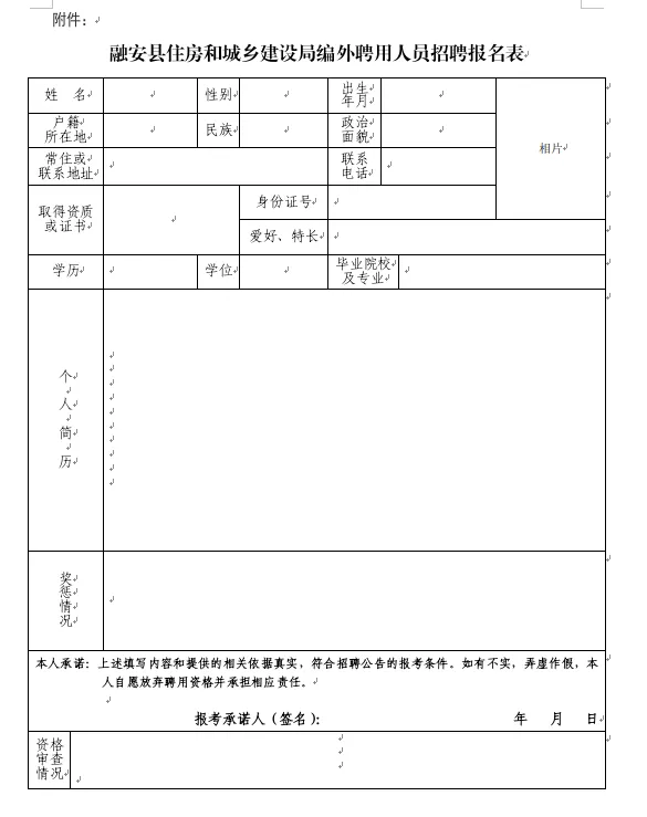 (1)報名方式:應聘者將報名表等相關材料發(fā)送至融安縣住建局郵箱:raxjsj@163.com,報名材料主要包括:報名表(請自行下載填寫,并手寫簽名)、身份證、學歷學位證書、資格證書、獲獎證書等。以上材料均需掃描成PDF版本。