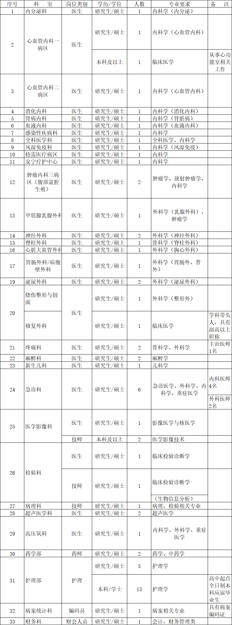 4.臨床醫(yī)師、醫(yī)技崗位人員要求35周歲以下,博士及急需緊缺專業(yè)條件可適當放寬;護理人員要求為應屆畢業(yè)生,25周歲及以下,碩士研究生及以上學歷者可放寬年齡條件。