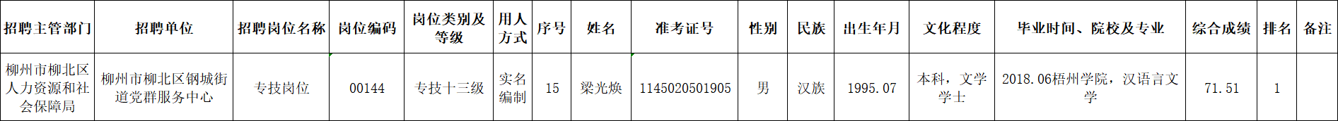 根據(jù)《柳州市2025年度下半年事業(yè)單位公開考試招聘工作人員公告》要求及安排,梁光煥同志經(jīng)面試、考察、體檢合格,符合聘用條件。經(jīng)研究決定,擬聘用梁光煥同志為我區(qū)事業(yè)單位工作人員,現(xiàn)予以公示,公示期為5個工作日(2026年1月22日至2026年1月28日)。對擬聘用的同志如有異議,請以書面形式,并署真實姓名和聯(lián)系地址,于2026年1月28日前郵寄或直接送我單位(地址:柳州市勝利路12-8號柳北區(qū)政府4樓417室;郵編:545002,電話0772-2513360),群眾如實反映有關問題受法律保護。