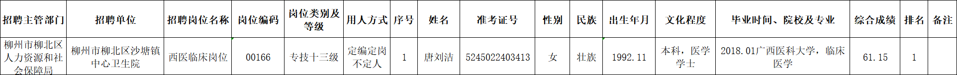 根據(jù)《柳州市2025年度下半年事業(yè)單位公開考試招聘工作人員公告》要求及安排,唐劉潔同志經(jīng)面試、考察、體檢合格,符合聘用條件。經(jīng)研究決定,擬聘用唐劉潔同志為我區(qū)事業(yè)單位工作人員,現(xiàn)予以公示,公示期為5個工作日(2026年1月22日至2026年1月28日)。對擬聘用的同志如有異議,請以書面形式,并署真實姓名和聯(lián)系地址,于2026年1月28日前郵寄或直接送我單位(地址:柳州市柳北區(qū)鷓鴣江六隊南200米(北外環(huán)路南)柳北區(qū)衛(wèi)生健康局512室;郵編:545002,電話0772-2802642),群眾如實反映有關(guān)問題受法律保護。
