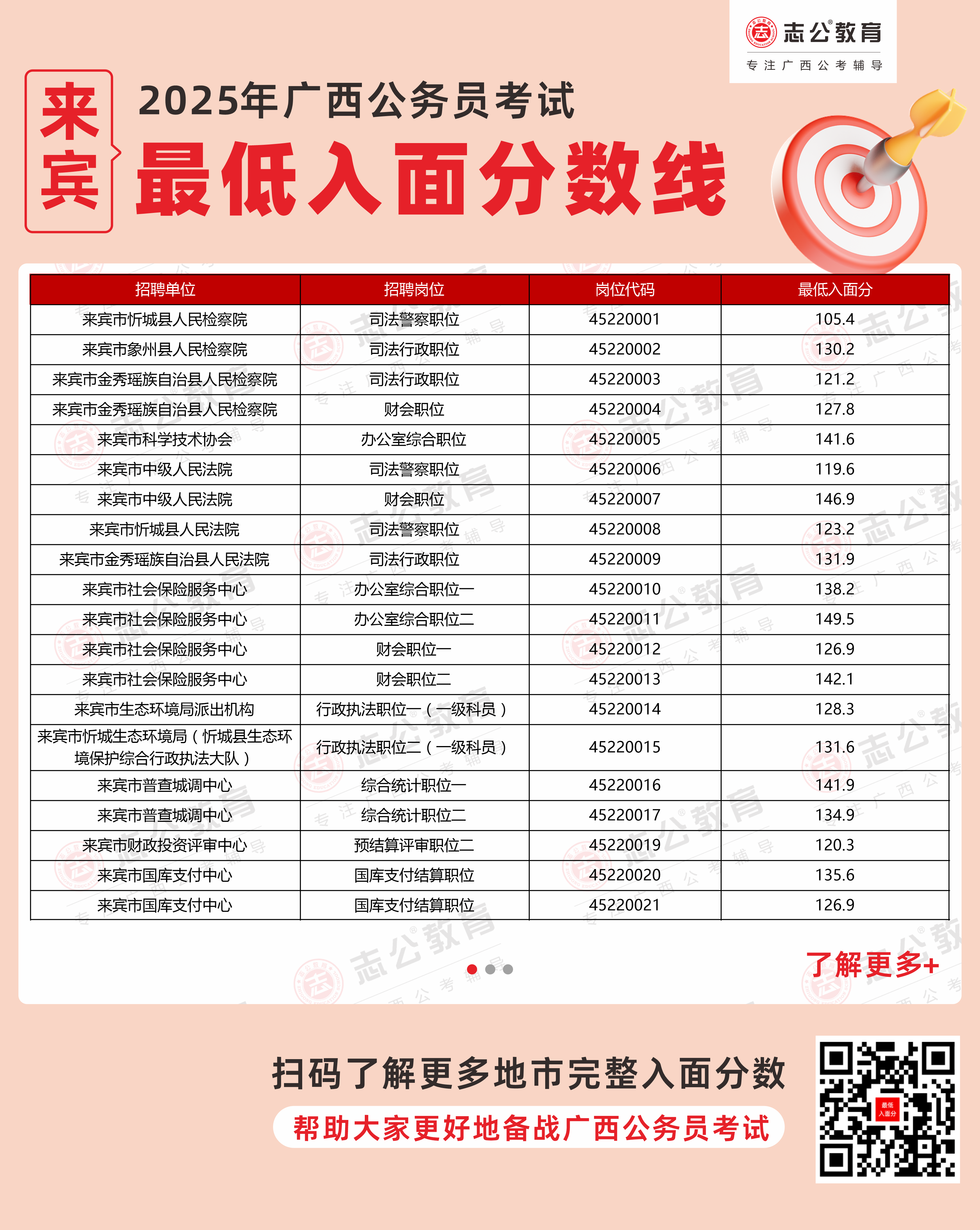 以下為志公教育根據(jù)官方發(fā)布的面試資格審查名單整理的來賓市部分單位的進面最低筆試分數(shù)(含照顧加分),數(shù)據(jù)僅供參考,具體以官方實際公布為準。