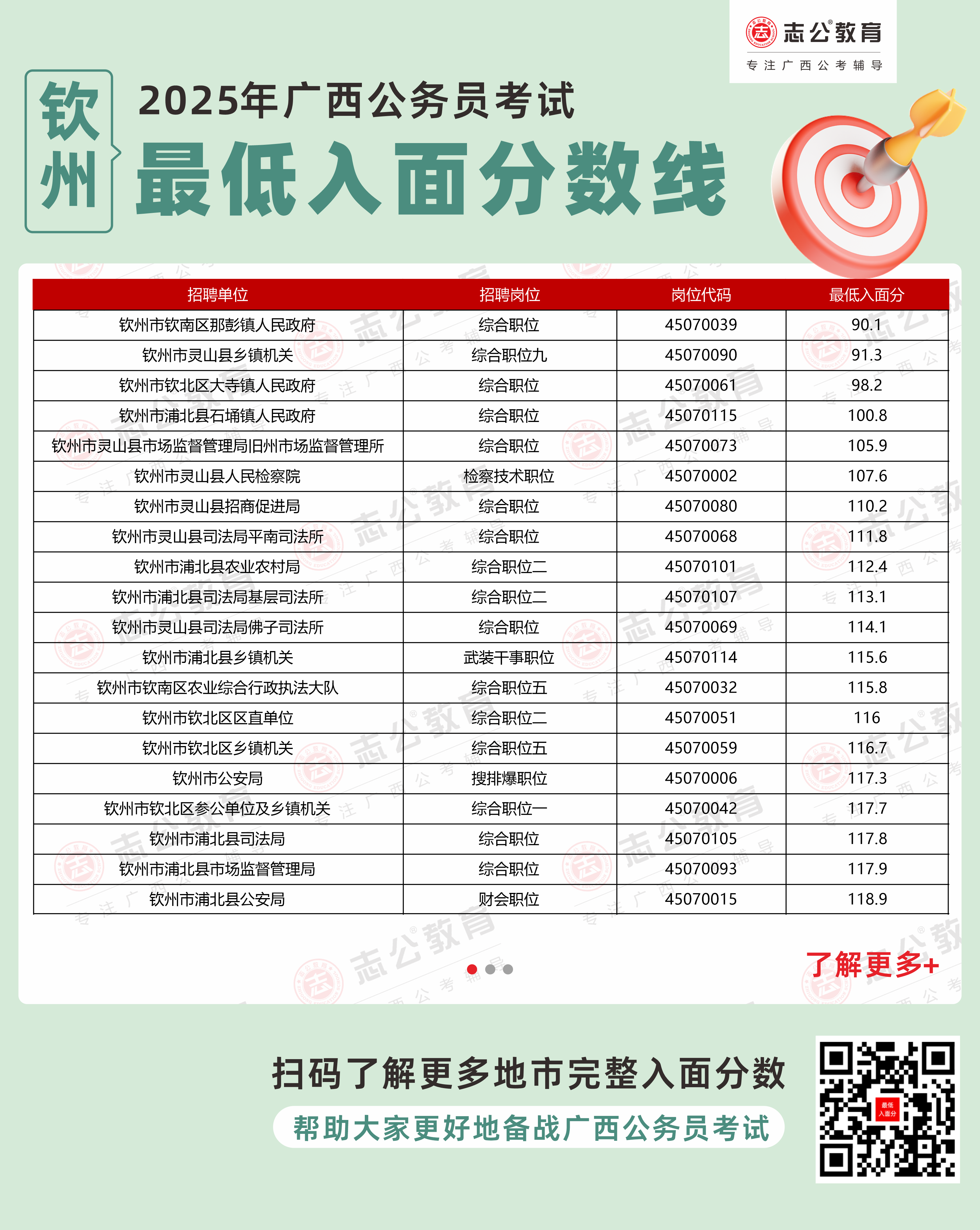 以下為志公教育根據(jù)官方發(fā)布的面試資格審查名單整理的欽州市部分單位的進(jìn)面最低筆試分?jǐn)?shù)(含照顧加分),數(shù)據(jù)僅供參考,具體以官方實(shí)際公布為準(zhǔn)。